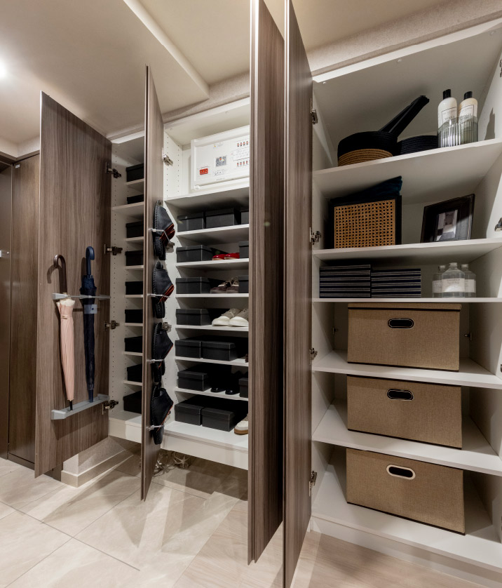 納戸、洋室収納、ニッチ季節物や生活用品など、それぞれの空間に合わせた収納設計で日々の暮らしに寄り添う収納が、空間をもっと快適に整えます。 -