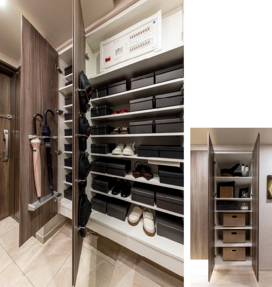 玄関・大型収納玄関には大容量収納を設置しました。中段の固定棚1段を除き、他は可動棚となっているため、収納する物に応じて自由にカスタマイズ可能です。さらに底板がないため、スーツケースや子供用の遊具など高さのある物もしっかり収納できます。 -
