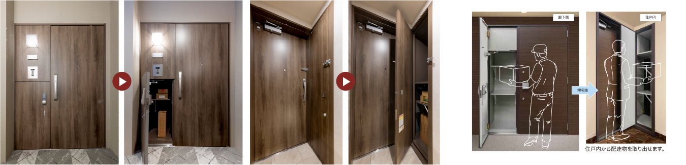 トレドーる るす楽(専有部宅配ロッカー)マンション玄関ドアと宅配ロッカーが合体。不在時でも配達物を受け取ることができ、運ばれた荷物を住戸内にある扉からドアを開けずに取り出すことができます。 -