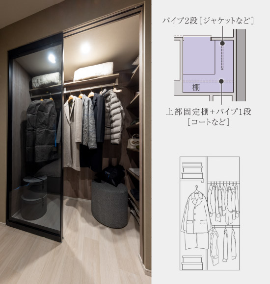 ウォークインクローゼット参考図ウォークインクローゼット※一部タイプ除く。ウォークインクローゼットには、2段パイブと1段パイプの組み合わせを設定。2段パイプには、ジャケットなどを。1段パイブには、コートなど丈の長い衣類を効率よく収納します。※写真の棚パイプ、建具はインテリアオプションです -