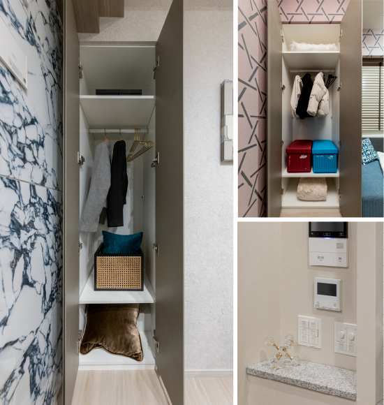 納戸、洋室収納、ニッチ季節物や生活用品など、それぞれの空間に合わせた収納設計で日々の暮らしに寄り添う収納が、空間をもっと快適に整えます。 -